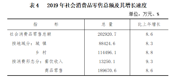 全年全區社會消費品零售總額202920.7萬元,增長8.6%。其中,城鎮消費品零售額88424.6萬元,增長8.3%;鄉村消費品零售額114496.1萬元,增長8.8%。